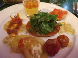 The beef tartare topped with quail egg is amazing. The accoutrement come on the side so you can add as you like. The inner chef in me likes this but I can see how things might go array... The “tomato tasting plate” features tomatoes in 7 different preparations makes me feel like a judge on Iron Chef. It’s a fun dish. A fish soup, bouillabaisse-style, is a fishy departure from the rest of the terroir driven items but I take full responsibility for that one.